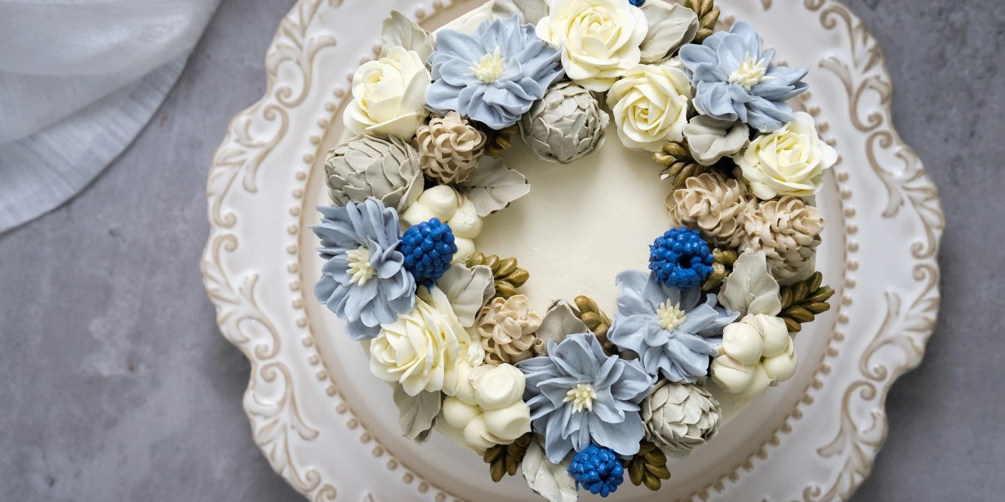 Step-by-step piping for pinecones, cotton flowers, Christmas roses, berries, and festive foliage in cozy blue-white-beige tones.